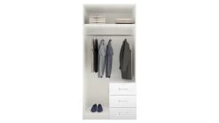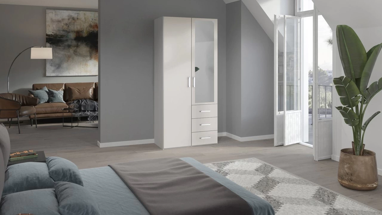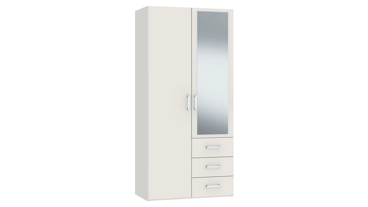 De draaideurkast heeft twee deuren met 1 spiegel en 3 lades. De binnenkant van de kledingkast bestaat uit 1 legplank en 1 roede over de volle breedte, en is uit te breiden met extra legplanken. De kledingkast is verkrijgbaar in diverse kleuren én afmetingen.
