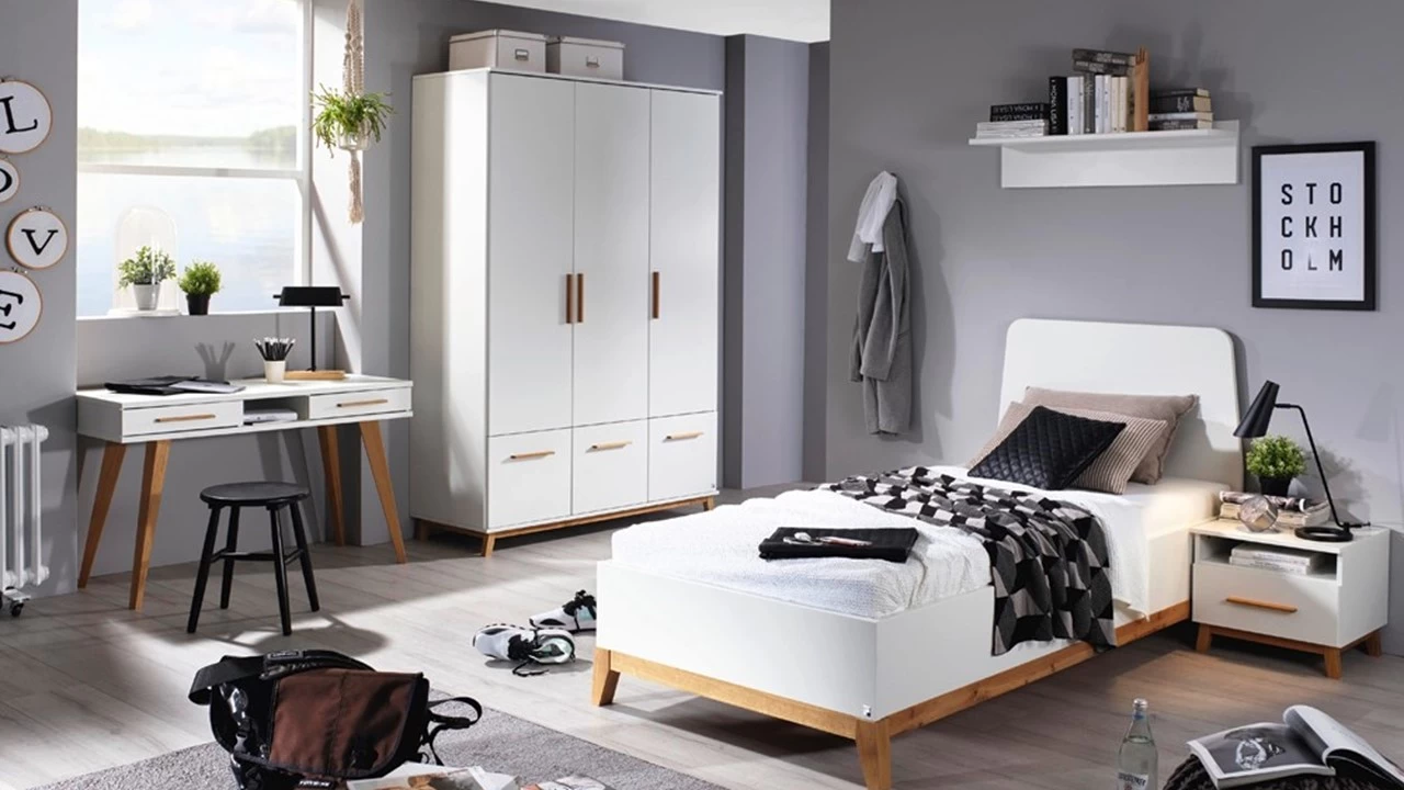 Maak je slaapkamer helemaal compleet in dezelfde stijl en combineer kast Nevada met laden eenvoudig met bijpassende meubelen zoals het Nevada bed, de commode, het bureau of met nachtkastjes.