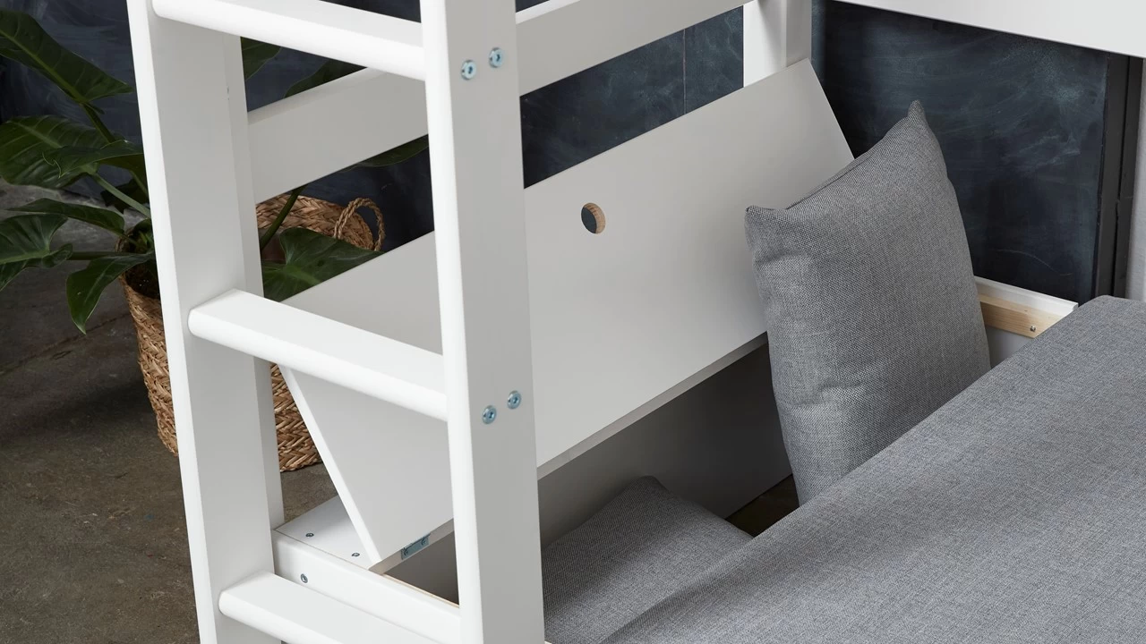 Een eigen hoogslaper met zit-/bedbank, extra logeerplek en werkplek ineen, hoe cool is dat? Deze eenpersoons hoogslaper Jip van Flexworld heeft een strak hoofd- en voetbord met panelen in de kleur wit, roze of grijs. Hierdoor staat deze mooi in elke kinderkamer! De hoogslaper is standaard uitgevoerd met een degelijke ladder en uitvalbeveiliging, zodat ook jonge kinderen hier veilig in slapen. Deze variant van het bed wordt in totaal geleverd met bedbodem, ladder, uitvalbeveiliging, bedbank en bureau, maar exclusief matras.