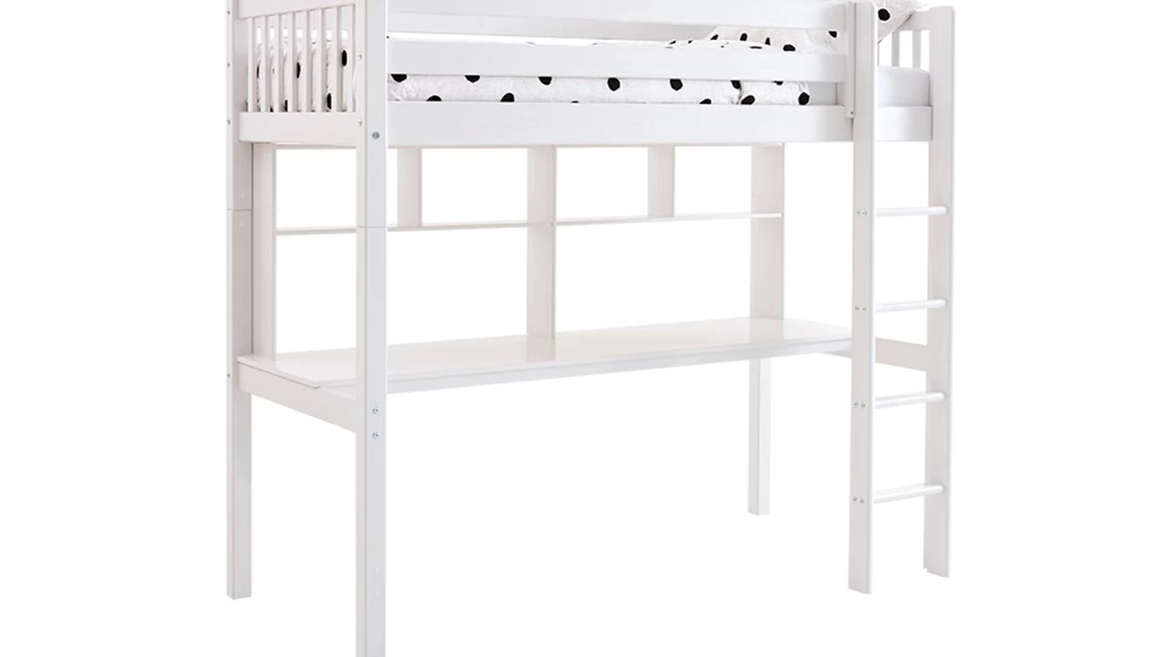 Deze witte eenpersoons hoogslaper Kris met bureau en opzet van Flexworld heeft een hoofd- en voetbord met spijlen voor een stijlvolle uitstraling. Voor extra veiligheid is de hoogslaper uitgevoerd met een degelijke ladder en uitvalbeveiliging aan de zijkant. Het is dus niet alleen geschikt voor oudere kinderen, maar zeker ook voor peuters en kleuters! Onder de hoogslaper vind je een bureau met opzet zodat er gemakkelijk bergen huiswerk gemaakt kan worden!