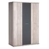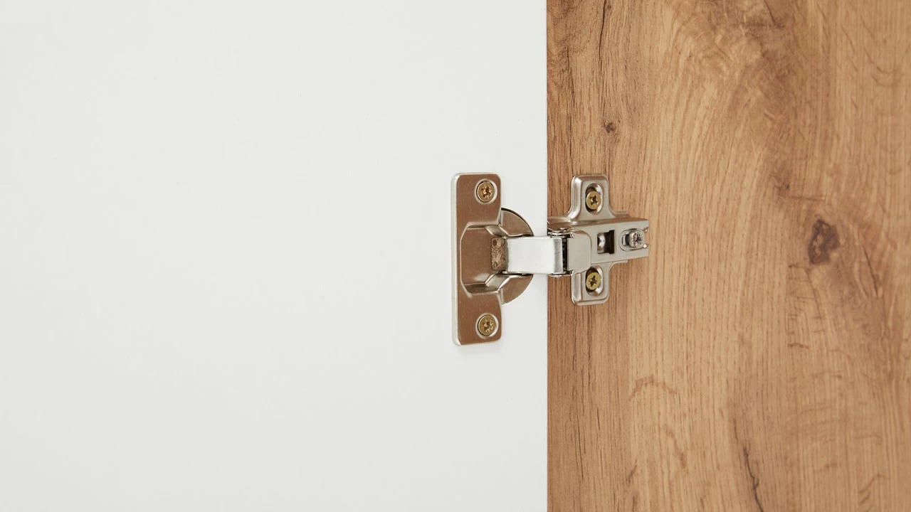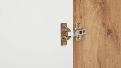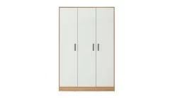 De kast is gemaakt van gefineerd spaanplaat met een eikenhouten opdruk. De kast heeft drie draaideuren. In één kastgedeelte zit een breed hanggedeelte met hierboven een legplank en in het andere smallere kastgedeelte zitten drie legplanken. Genoeg opbergruimte dus.