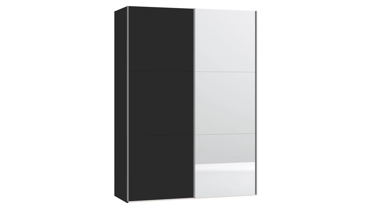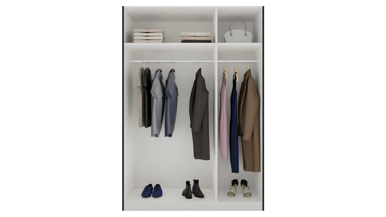 De kast is gemaakt van spaanplaat melamine met een zwarte opdruk. De kast heeft een houten- én een spiegeldeur. In ieder kastgedeelte zit een breed hanggedeelte met hierboven een legplank. Meer dan genoeg opbergruimte dus.