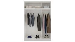 De kast is gemaakt van spaanplaat melamine met een zwarte opdruk. De kast heeft twee houten schuifdeuren. In ieder kastgedeelte zit een breed hanggedeelte met hierboven een legplank. Meer dan genoeg opbergruimte dus.